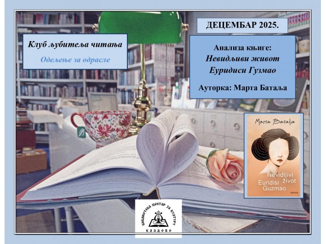 22.12.2025.У петак, 26.12. 2025. године у просторијама Библиотеке “Центар за културу” Кладово, Клуб љубитеља читања се састаје од 18 часова и разговарамо о роману “Невидљиви живот Еуридиси Гузмао”, бразилске ауторке Марте Батаље.