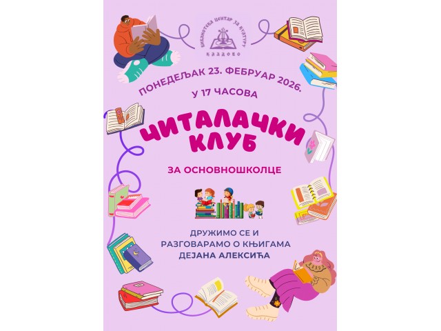 18.02.2026.На Дечјем одељењу Библиотеке „Центар за културу“ Кладово у понедељак, 23. фебруара 2026. године, од 17 часова биће одржано ново окупљање Читалачког клуба за основношколце.