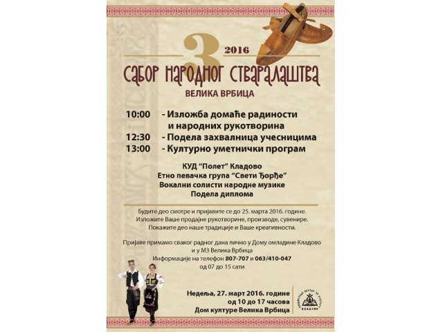 20.03.2016.Mesna zajednica Velika Vrbica po treći put organizuje okupljanje svojih meštana i gostiju sa željom da se predstave u domenu narodnog stvaralaštva. Sa tim ciljem, ovogodišnje okupljanje nazvali su 3. Sabor narodnog stvaralaštva, sa željom da postane tradicionalna manifestacija.
