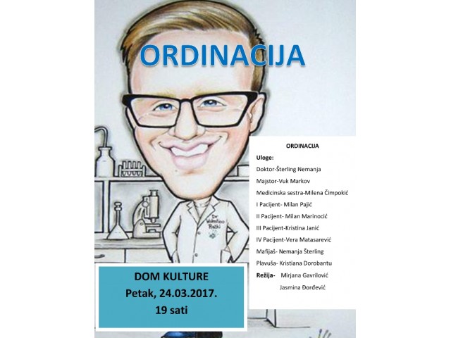 Amaterska pozorišna predstava učenika srednjih škola Kladovo „Ordinacija“ biće prikazana u petak 24. marta 2017. u19h .