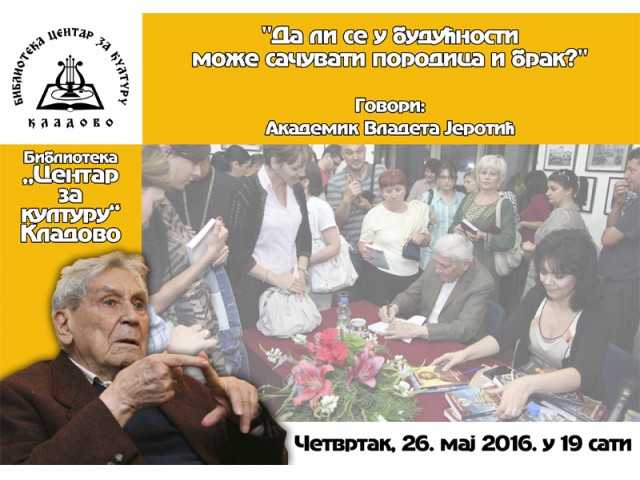 22.05.2016.Akademik Vladeta Jerotić gostuje u Biblioteci „Centar za kulturu“ Kladovo u četvrtak 26. maja 2016. godine sa početkom u 19 sati, družeći se već treću godinu sa publikom koja pomno prati njegova predavanja i izdavačku produkciju.