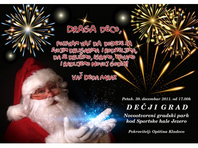 26.12.2011.Novogodišnji program za decu priređuje se u novotovorenom Dečjem gradu u gradskom parku kraj Sportskog rekreacionog centra „Jezero“.