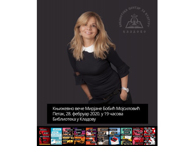 22.02.2020.Bestseler autorka Mirjana Bobić Mojsilović održaće 28. februara od 19 sati književno veče u Biblioteci "Cenatr za kulturu" Kladovo. Tom prilikom, čitaocima će predstaviti svoj poslednji roman „Glad“, ali će govoriti i o prethodnim knjigama.