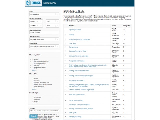Obaveštavamo Vas da je na internet stranici https://sr.cobiss.net/ objavljena aplikacija Najčitanija građa koja omogućava ispis spiskova najčešće pozajmljivane građe u bibliotekama koje su u COBISS.SR sistemu i imaju automatizovanu pozajmicu