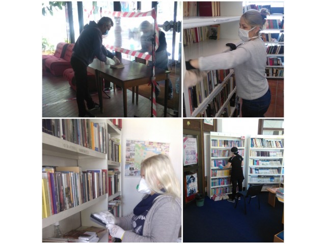 Vaši bibliotekari, u novim okolnostima, čine sve da uslovi za rad i korišćenje knjižnog fonda budu bezbedniji za sve nas. U toku je prepakivanje, čišćenje i dezinfikovanje celokupnog knjižnog fonda kao i prostorija. U nedostatku polica za knjige, stare osposobljavamo pa makar i privremeno, za smeštaj knjiga.