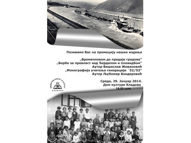 23.01.2014.Biblioteka "Centar za kulturu" Kladovo u sredu 29. januara 2014. godine sa početkom u 18,00 sati (Dom kulture) najavljuje svečanu promociju svojih izdanja vezanih za istoriju svog zavičaja: