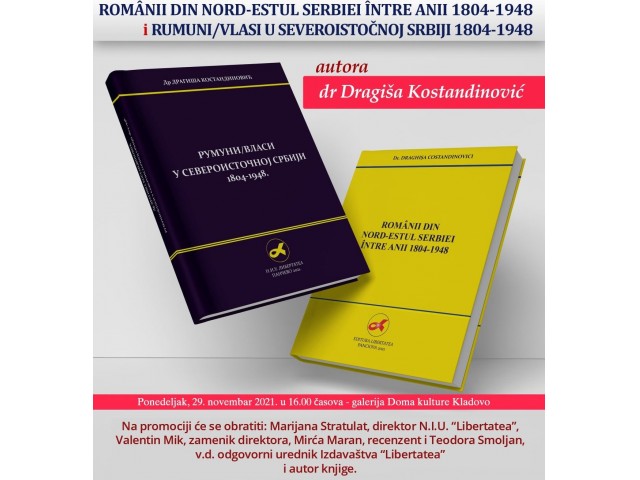 23.11.2021.Izdavačka kuća “Libertatea” iz Pančeva promoviše svoje izdanje „Rumuni/Vlasi u Severoistočnoj Srbiji 1804-1948“ (Românii din Nord-Estul Serbiei între anii 1804-1948) autora dr Dragiše Kostandinovića iz Kladova.