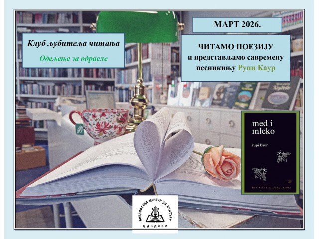 24.03.2026.У петак, 27.03. 2026. године у просторијама Библиотеке “Центар за културу” Кладово, Клуб љубитеља читања се састаје од 18 часова. Поводом Међународног дана поезије, који се обележава 21. марта, на дружењу чланица клуба читамо поезију по избору чланица са посебним освртом на савремену песникињу Рупи Каур.