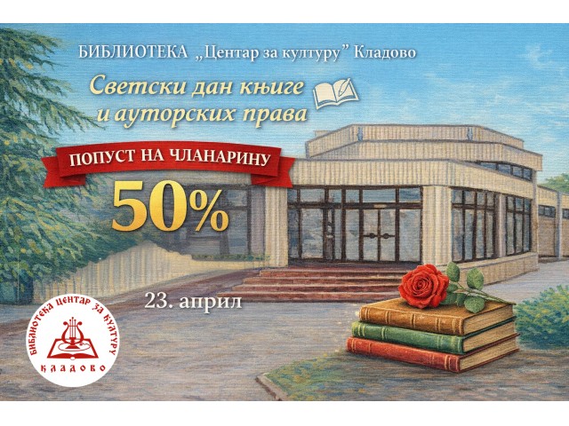 22.04.2026.Поводом Светског дана књиге и ауторских права, Библиотека „Центар за културу“ Кладово, као и сваке године, омогућава упис нових чланова и обнову чланства за све категорије корисника по цени сниженој за 50%.