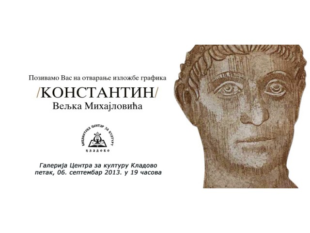 01.09.2013.Izložba grafika pod nazivom „Konstantin“ autora Veljka Mihajlovića iz Beograda, biće otvorena u galeriji Centra za kulturu Kladovo u petak 06. septembra 2013. godine u 19,00 sati. Izložba se organizuje povodom 1700 godina Milanskog edikta.