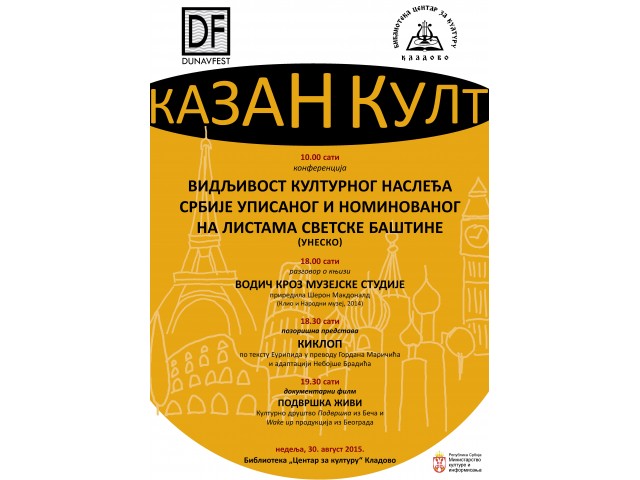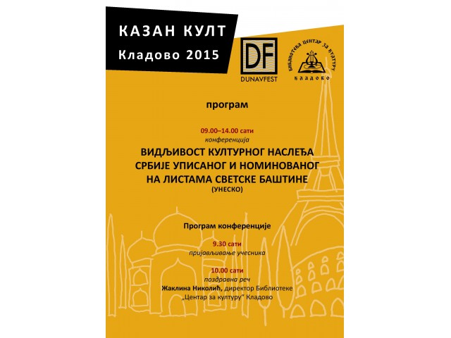 25.08.2015.Biblioteka „Centar za kulturu“ Kladovo realizuje projekt koji sufinansira Ministarstvo kulture i informisanja Republike Srbije, a to je stručna konferencija pod nazivom „Vidljivost kulturnog nasleđa Srbije upisanog i nominovanog na Listama svetske baštine (UNESKO 1965-2015)”. Svojevrsni susret razmene znanja i iskustva stručnjaka i kulturnih poslenika koji se bave nasleđem, njegovim tumačenjem, očuvanjem i predstavljanjem, posebno onih koji su svojim posvećenim radom na izradi nominacijskih dosijea i sprovođenju procedure za upis na reprezentativne i tentetivne liste svetske baštine čovečanstva i nematerijalnog kulturnog nasleđa čovečanstva, doprineli da se kulturno nasleđa Srbije nominuje ili upiše na relevantne Liste svetske baštine (UNESKO) i na taj način, doprineli ukupnom podizanju društvene svesti o značaju svetske baštine u Srbiji.