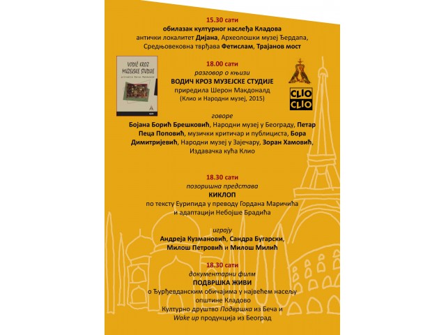 Za učesnike i goste konferencije, u popodenevnim satima, obezbeđen je obilazak kulturnog nasleđa Kladova /antički lokaliet Dijana, Hidroelektrana „Đerdap 1“,Arheološki muzej Đerdapa , srednjovekovna tvrđava Fetislam, Trajanov most /