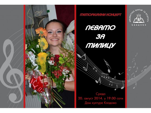 15.08.2014.Biblioteka „Centar za kulturu“ Kladovo organizuje memorijalni koncert „Pevamo za Milicu“ koji će biti priređen u sredu 20. avgusta 2014. godine sa početkom u 19,00 sati u galerijskom prostoru.