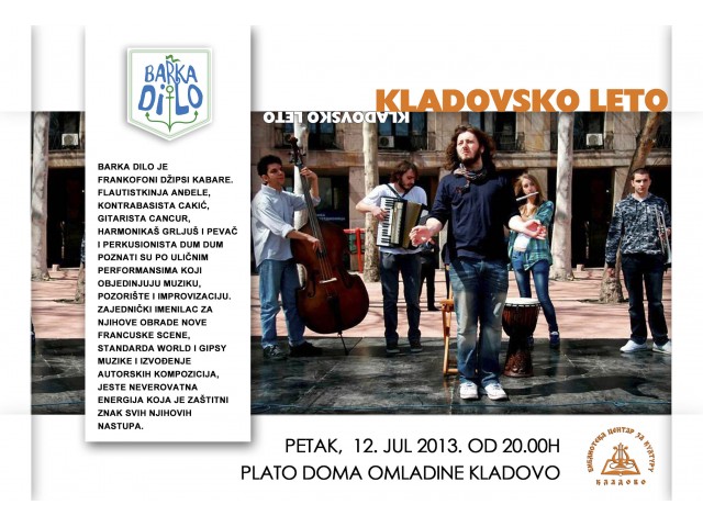 08.07.2013.Beogradski bend Barka Dilo, zvanično najbolji beogradski ulični zabavljači, gostuje na manifestaciji „Kladovsko leto“ u petak 12. jula 2013. od 20,00 sati na platou ispred Doma omladine u Kladovu.
