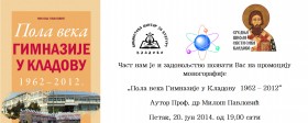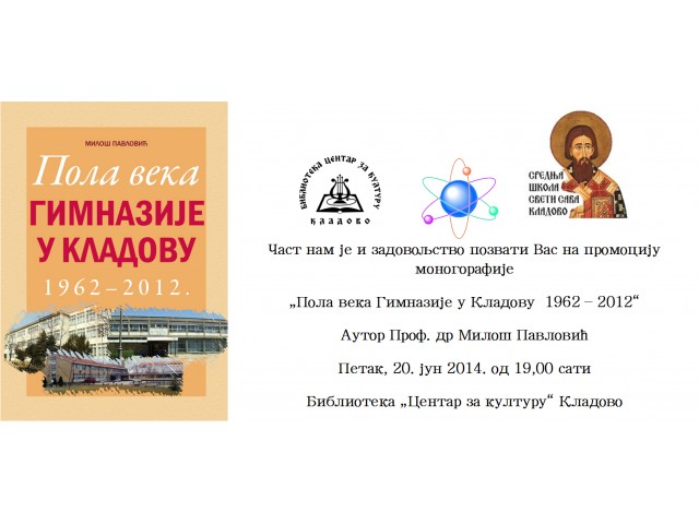 17.06.2014.Monografija o pola veka rada Gimnazije u Kladovu, promovise u petak 20. jula 2014. godine u 19,00 sati u prostorijama Biblioteke "Centar za kulturu" Kladovo.