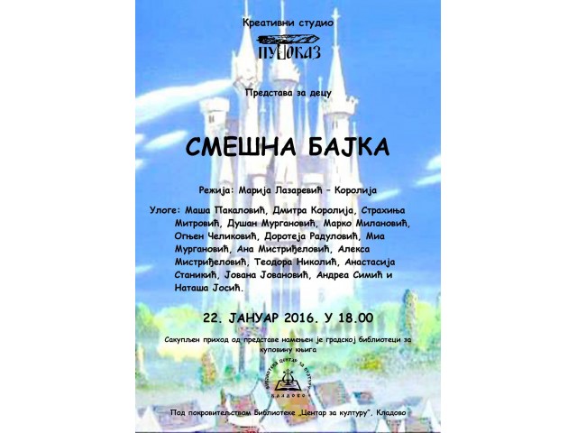 19.01.2016.Kreativni studio za decu „Putokaz“ premijerno predstavlja novu predstavu koja nosi naziv „Smešna bajka“ u petak 22. januara 2016. godine u 18,00 sati u velikoj sali Doma kulture u Kladovu.
